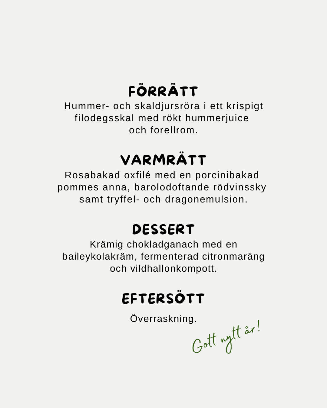 Låt årets sista kväll bli något extra! 🥂🎇 Vår nyårskasse erbjuder en utsökt fyrarättersmeny för en oförglömlig middag hemma! 😋